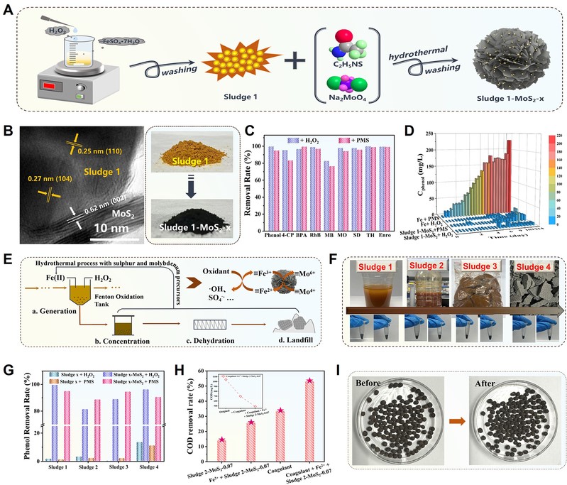 研究团队采用一步水热法,将铁泥与MoS2进行化学复合(Sludge-MoS2),并利用MoS2的助催化效应,使得铁泥中的铁氧化物(≡Fe3+)重新具有芬顿反应的活性,实现了铁泥的绿色资源化利用。MoS2表面暴露的≡Mo4+还原活性中心促进了铁泥表面铁离子的循环,提高了表面≡Fe2+的浓度;而MoS2边缘暴露的低配位S具有捕获质子的特性,可在复合催化剂表面构建酸性微环境,促进表面铁离子向“剪切面”的扩散,提高了固液界面处Fe2+的浓度,从而使得失活后的铁泥重新具有活化H2O2或过一硫酸氢盐等氧化剂的能力。实验证实,实验室模拟的铁泥和化工厂处理废水实际产生的铁泥,在经过MoS2改性后都可实现对酚类、抗生素类以及染料类等有机污染物高效的降解活性。此外,资源化后的Sludge-MoS2催化剂具有稳定且长效的降解有机污染物的性能,可实现对苯酚14天以上的长效降解。
