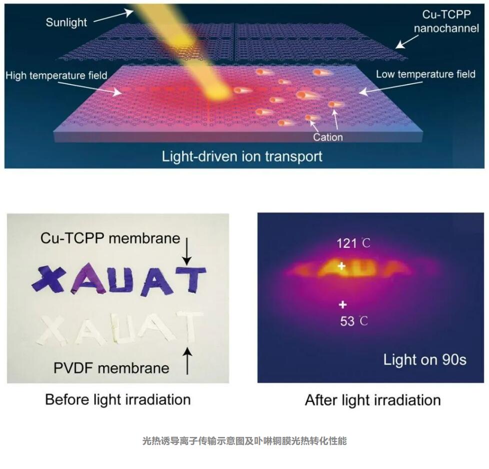 光热诱导离子传输示意图及卟啉铜膜光热转化性能。(课题组供图)