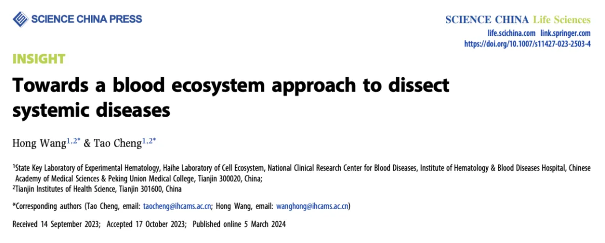 近日,中国医学科学院血液病医院(中国医学科学院血液学研究所)程涛教授和王洪研究员应邀在《科学中国-生命科学》上发表的观点论文,进一步系统阐释了血液生态这一创新性概念,并深入探讨了血液生态研究新范式在系统性疾病研究中的广泛应用前景。