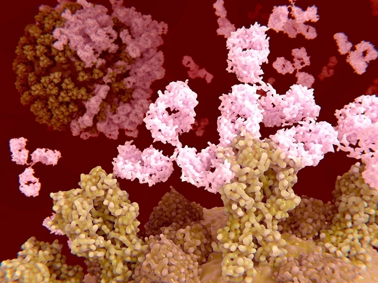 抗体(粉色)与流感病毒蛋白(黄色)结合想象图。图片来源:Juan Gaertner/Science Photo Library