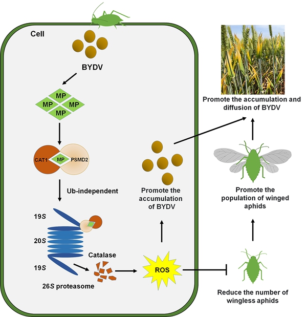 该研究发现病毒的运输蛋白(MP)过表达显著促进了小麦中ROS的积累,导致黄矮表型的出现。相反,小麦为了抵御病毒感染扩展,利用自身TaCATs抑制病毒侵染。病毒又为了反防御,克服TaCATs抑制,MP通过26S蛋白酶体途径,促进蛋白酶体受体蛋白PSMD2和TaCAT1的互作,从而促进TaCATs的降解。TaCATs被降解后破坏了小麦体内的ROS平衡,导致ROS含量升高。ROS含量的升高促进了BYDV的积累,同时又抑制了介体蚜虫的繁殖,并促进了有翅蚜的产生,推动了有翅蚜迁飞到健康小麦开始下一轮循回传毒。