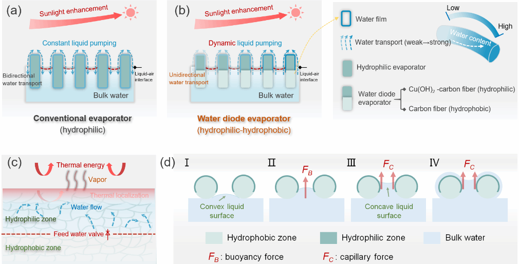 近年来,用于缓解全球水问题的界面太阳能驱动蒸发(ISDE)技术引起了研究者的极大关注。其中,ISDE系统的供水管理在有效的能量匹配中具有越来越重要的作用。传统系统中输入能量和所需能量之间的不匹配严重影响了转换效率。王成兵教授团队提出并设计的“水二极管”光热蒸发器,得益于非对称表面润湿性梯度和单向水传输特点,蒸发器的供水速度可以随着光强的增加而显著加快,表现出对光照强度的自适应能力。