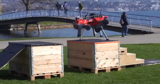 瑞士苏黎世联邦理工学院的一个研究团队训练近50公斤重的四足机器人ANYmal模仿人类的跑酷运动,这需要运动能力和快速决策相结合。