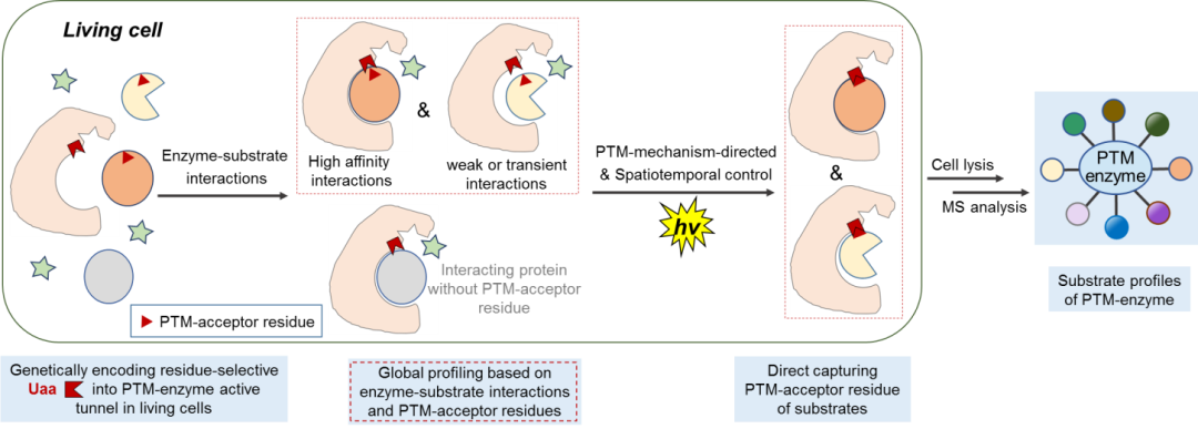 精确解析“修饰调控酶—底物”的动态互作对于深入理解蛋白质功能和靶标发现具有重要意义,但利用现有技术直接进行“修饰调控酶—底物”的时空动态全局性解析,尤其对动态和微弱相互作用产生的修饰底物、修饰位点的准确鉴定,非常具有挑战性。