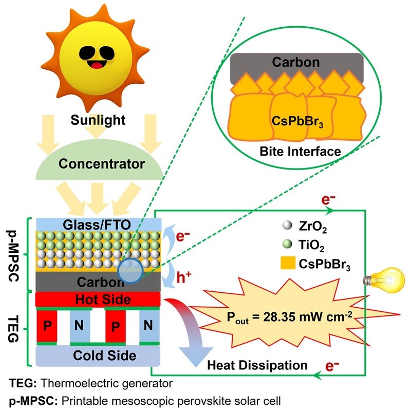 近日,华东理工大学化学与分子工程学院副研究员武文俊课题组为全无机可印刷介观钙钛矿太阳能电池(p-MPSCs)开创了新基准,并且从热和光两个角度,充分挖掘其太阳能利用的潜力,已构建高功率输出和高稳定性的光伏器件。相关研究成果在线发表于《器件》。