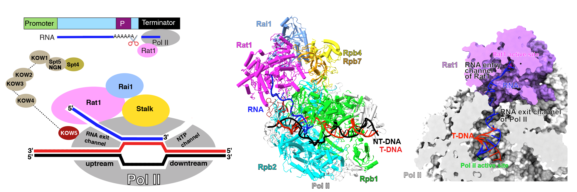 外切酶Rat1与Pol II形成的复合物结构(左模式图,中和右复合物结构图) 图片来源于《自然》