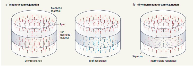 新加坡科学家通过施加外部磁场或电压来引导自由层中的斯格明子,使电阻出现一个中间值,与高、低电阻之间的差异高达70%。