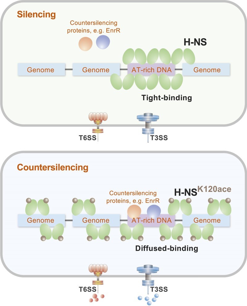 在前期基础上,研究团队以肠杆菌科病原菌杀鱼爱德华氏菌为模式菌株,研究发现赖氨酸乙酰化修饰影响H-NS对T3/T6SS的沉默,表明赖氨酸乙酰化是一种抗H-NS沉默机制。杀鱼爱德华氏菌响应环境中的氨基酸营养或免疫代谢物水平后,调节H-NS的赖氨酸乙酰化修饰状态,其中K120位点乙酰化显著削弱了H-NS对高AT含量DNA的占有能力。这些高AT含量DNA主要集中在水平基因转移元件的启动子区域,失去占有能力的H-NS更容易被抗沉默蛋白驱逐,从而彻底解除对T3/T6SS的沉默抑制。