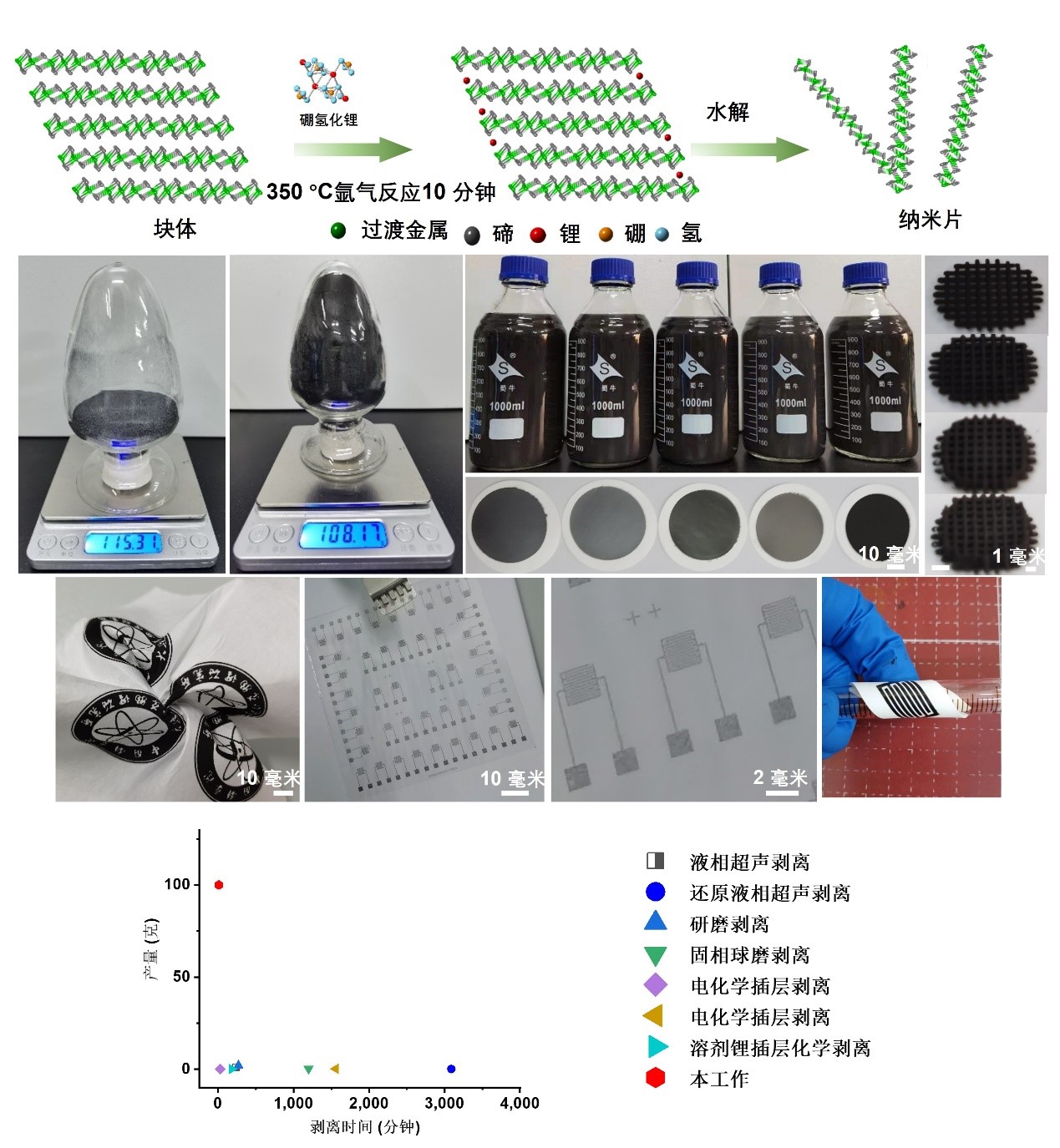 研究团队开拓了固相化学插层剥离方法,通过高温固相反应降低插层反应的活化能、使用硼氢化锂作为安全高效的固相锂插层试剂,从而实现安全、高效、快速的插层剥离。整个插层剥离过程只需10分钟,宏量制备出了百克量级的碲化铌纳米片,与此前研究制备量均小于1克比,提升了两个数量级。在此基础上,团队制备出了5种不同过渡金属的碲化物纳米片和12种合金化合物纳米片,证明该方法具有普适性。