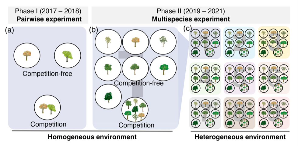 研究团队围绕处于竞争劣势的植物如何维持自身种群这一问题,进行了为期3年的幼苗实验,并基于10个乔木物种6750株幼苗的10个关键功能性状,全面系统地检验了不同情境下种内性状的变化特征。
