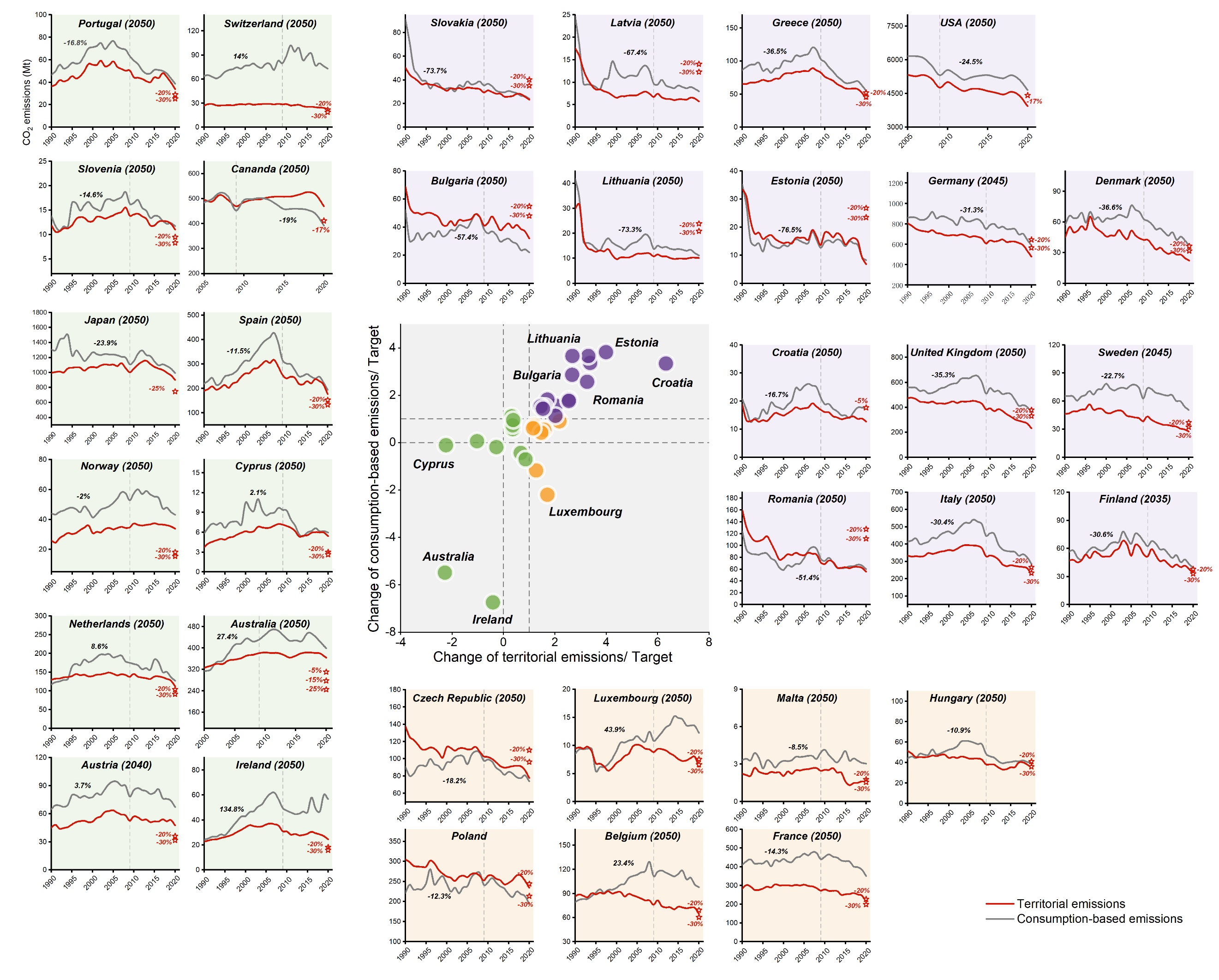 本研究深入剖析了各国在哥本哈根气候减缓目标上的实现情况,并揭示了不同组别国家在减排效果上存在差异的深层原因。此外,通过核算消费端的碳排放量以准确区分实际的领土减排工作与潜在的外包活动,对于公正、透明地评估各国减排贡献至关重要,有助于实现对排放情况的全面、精准追踪。