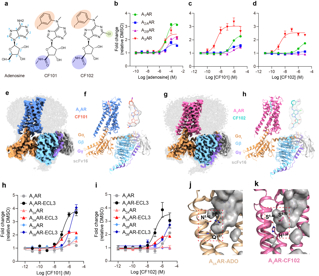 A3AR与选择性配体的复合物冷冻电镜结构及其配体选择性机制 图片来源于《自然—通讯》