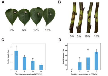 在这项研究中,何裕建团队发现,绿木霉菌株的培养滤液能够破坏梨树腐烂病菌的菌丝膜,有效抑制病原菌生长;离体条件下,对梨树腐烂病的生物防治效率可达73.5%。进一步研究显示,绿木霉菌培养滤液显著下调了梨树腐烂病菌抗氧化系统相关基因的表达,并抑制病原菌过氧化氢酶和超氧化物歧化酶的活性,导致病原菌菌丝细胞活性氧积累,使其细胞受损甚至死亡。此外,通过LC-MS分析鉴定出绿木霉菌培养滤液的活性成分之一为青蒿琥酯,该菌株已保藏于中国普通微生物菌种保藏管理中心(CGMCC No.40848)。