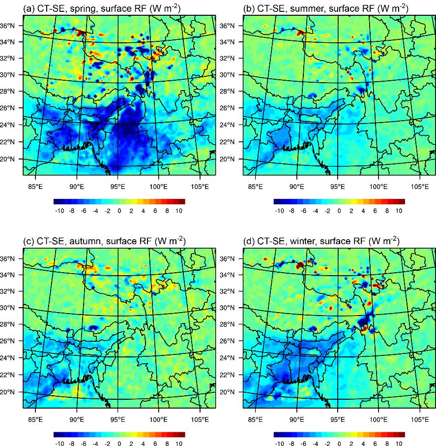 此外,南亚和东南亚排放的黑碳气溶胶在青藏高原大气层中产生正的辐射强迫,进一步加剧了该地区的暖化效应。这种辐射强迫的季节性变化也在研究中得到了揭示,冬季和夏季的辐射强迫值尤为显著。