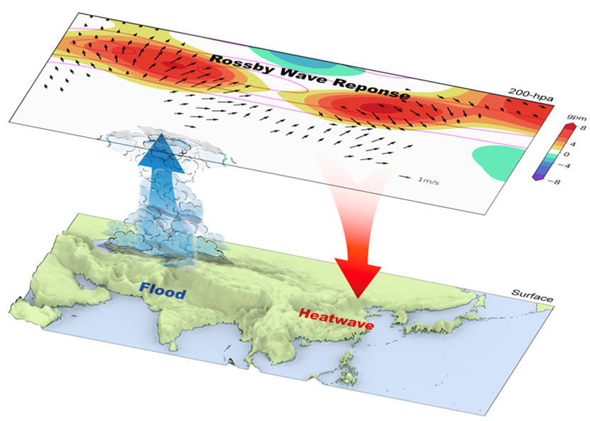 4月25日,复旦大学周文课题组与美国加州大学圣迭戈分校Scripps海洋研究所合作,在《科学进展》发表封面论文,系统性揭示了巴基斯坦洪水和东亚热浪间的动力途径机制,并表明巴基斯坦地区作为“最佳激发点”,其盛夏的对流可以扰动对流层上层西风带,导致东亚地区出现持续的热浪天气,相关结果有助于提高我国夏季极端事件的次季节预报能力。
