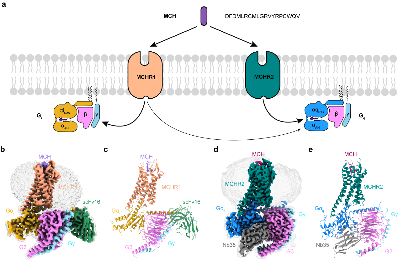MCH-MCHR1-Gi 和 MCH-MCHR2-Gq复合物的结构。图片来源于《细胞—发现》