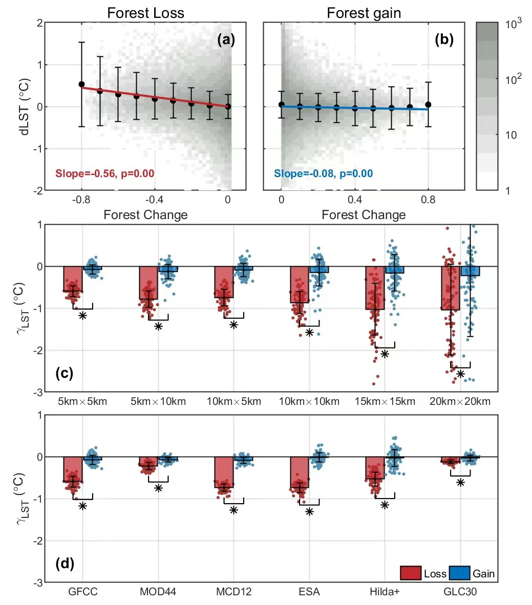 热带森林的增加不仅从大气中吸收二氧化碳,而且通过蒸散冷却的方式减缓气候变化。因此,逆转当前热带森林的减少趋势被认为是一项重要的基于自然的气候变化解决方案,被不少热带国家纳入履约《巴黎协定》的国家自主贡献之中。然而,过往研究通常将森林增加视为森林减少的简单逆过程,并以此评估森林变化对地表温度的影响,导致评估结果不可靠,阻碍了气候变化应对策略的科学制订。