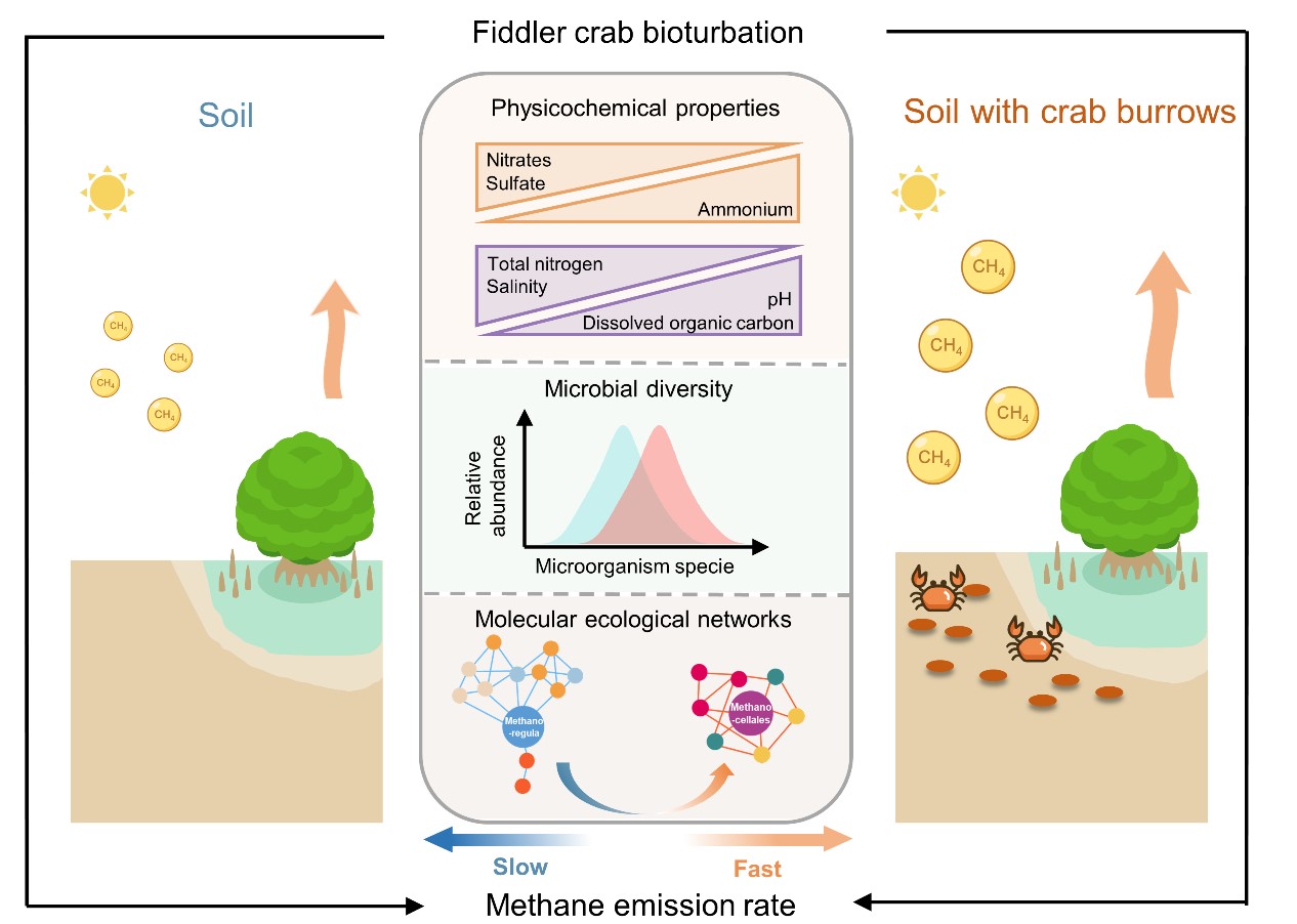 底栖生物扰动是红树林生态系统最重要的环境特征之一,在红树林碳循环过程中起着重要的调节作用。土壤中大型穴居大型动物群类似于生物扰动器,其存在和活动可通过改变土壤的物理化学性质从而显著影响微生物驱动的碳循环过程。然而,目前关于红树林底栖动物(如招潮蟹)的挖洞活动对土壤甲烷排放及其在微生物机制尚不清楚。