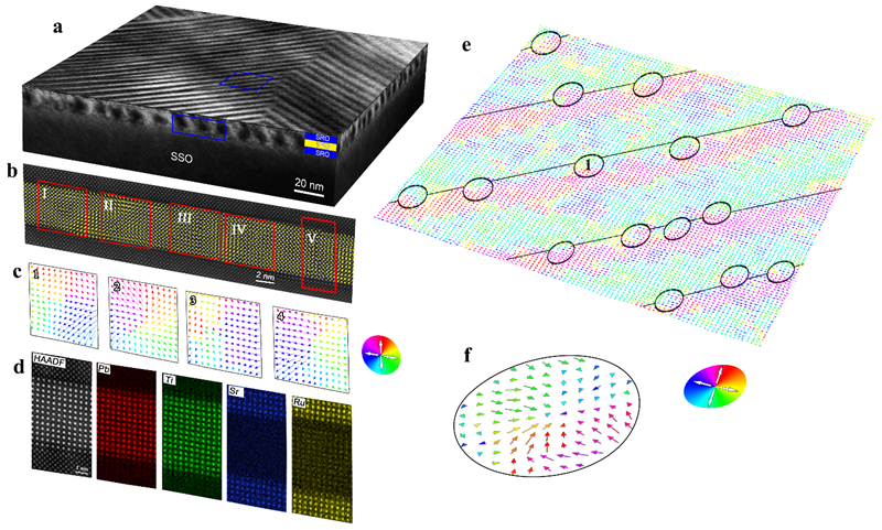 SmScO3衬底上SrRuO3/PbTiO3/SrRuO3三层薄膜的截面样(b-d)和平面样(e, f)的像差校正透射电镜图像,展示了极化布洛赫点的原子尺度极化构型。
