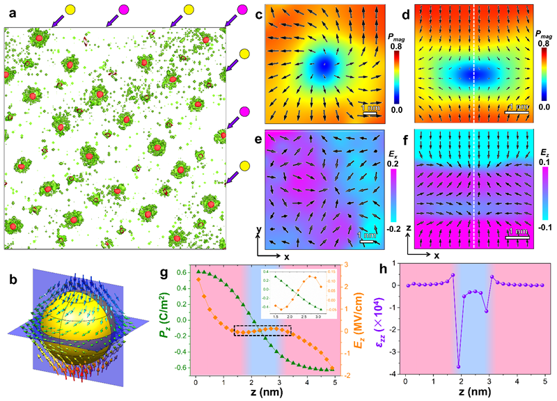 极化布洛赫点的负电容效应的相场模拟结果。(a)负电容区域(绿色)和布洛赫点(红色)的分布;(b-f)布洛赫点的极化构型图和电场分布图;(g, h)穿过布洛赫点的极化、电场、介电常数分布曲线。本文图片由课题组供图。