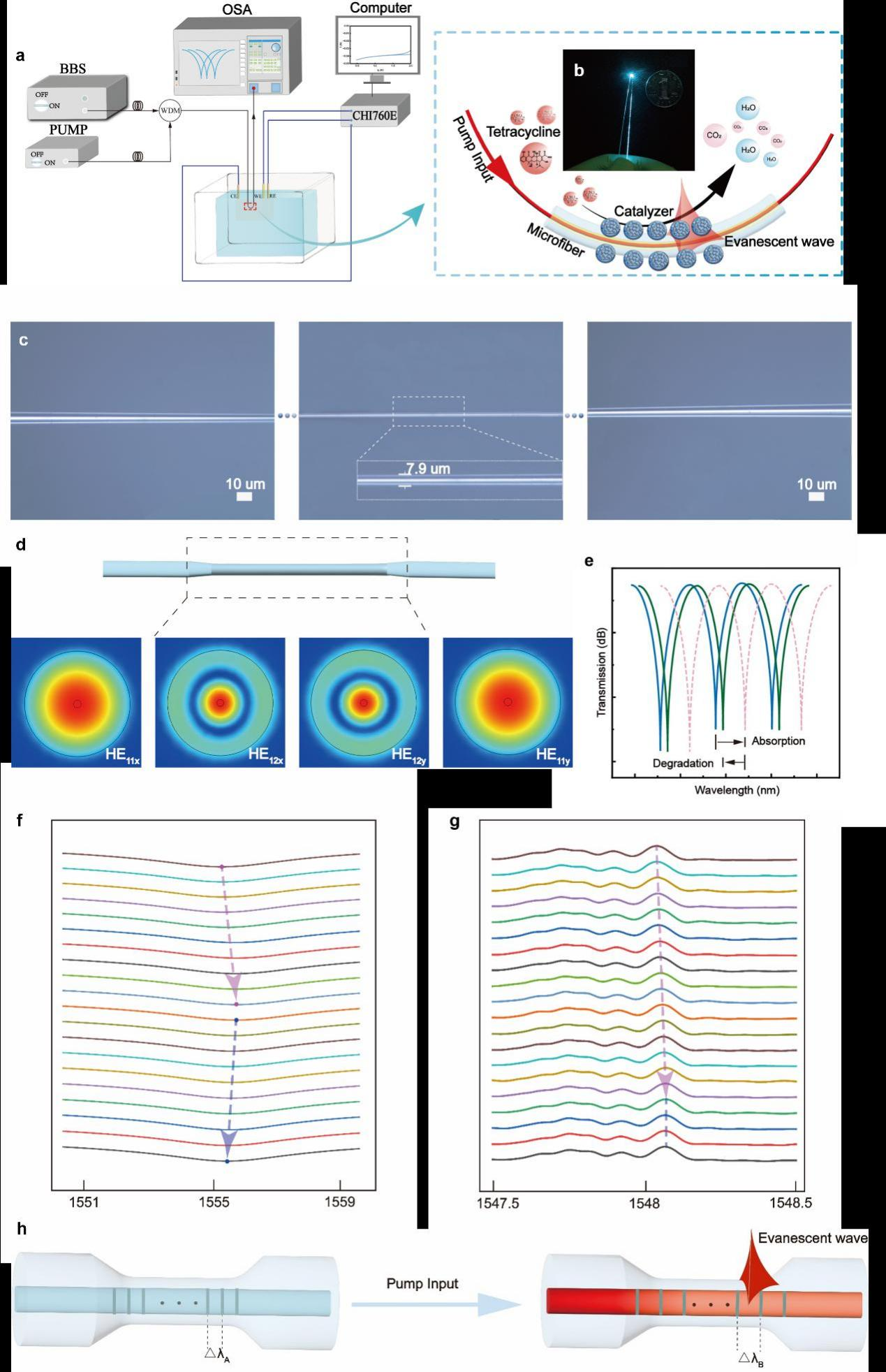 针对上述光电催化反应中关键参量监测所面临的难题,关柏鸥团队以微光纤为载体,通过将催化剂和污染物有序地组装于光纤表面,在光纤表面构建“光电催化纤上实验室”,将激发催化反应的光源替换成泵浦激光耦合于光纤中,通过光纤倏逝场激发光纤表面的光催化效应,实现了对光电催化反应过程的模拟;由于光纤倏逝场具备快速响应能力并且穿透深度在亚微米尺寸范围,因此光纤能够通过倏逝场感知表面“纤上实验室”的反应过程,实现对催化反应中催化剂表面反应物浓度和热效应两个关键参量的实时监测。通过微光纤光催化传感器的监测,研究团队获得了实时参数和催化活性之间的稳定的相关性,为催化过程和机理的理解提供了重要的基础。