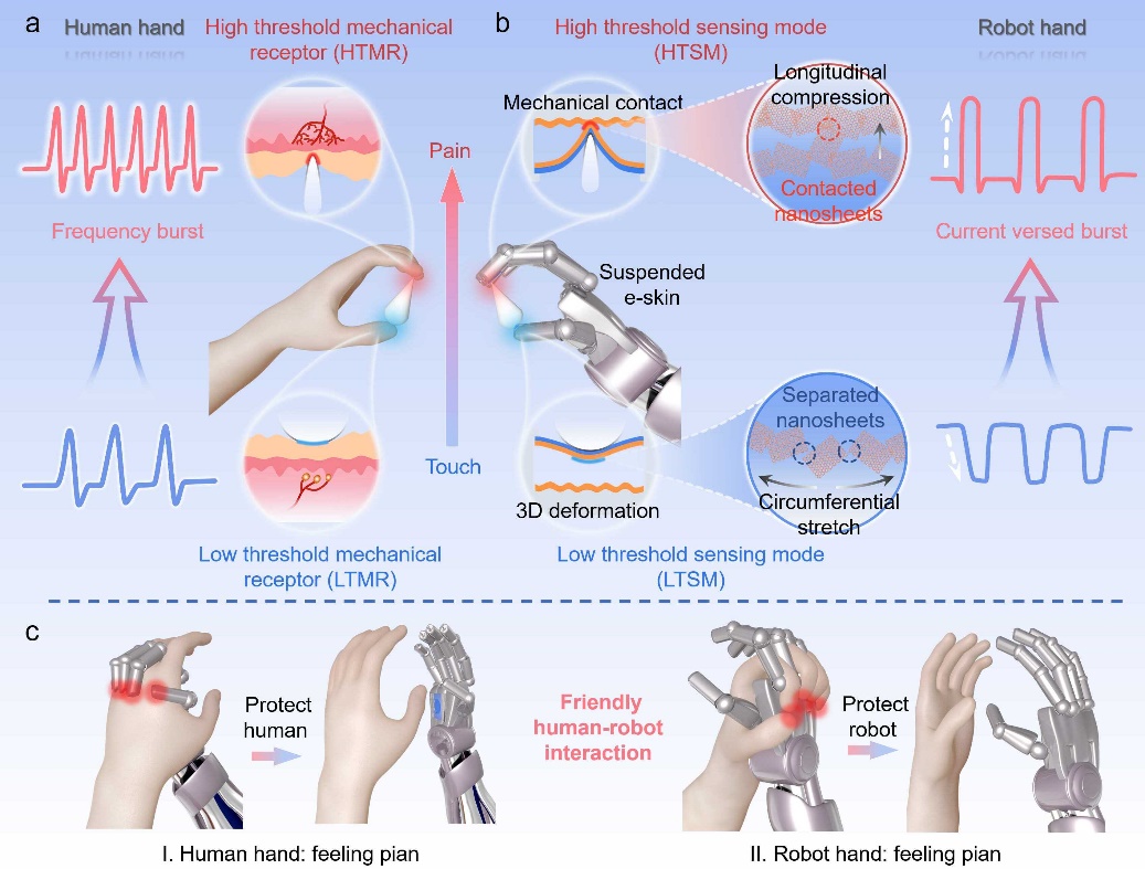 此外,人体皮肤追求超灵敏触觉和痛觉功能的高效集成,并通过电信号突变行为来指示两种感觉之间的动态切换。