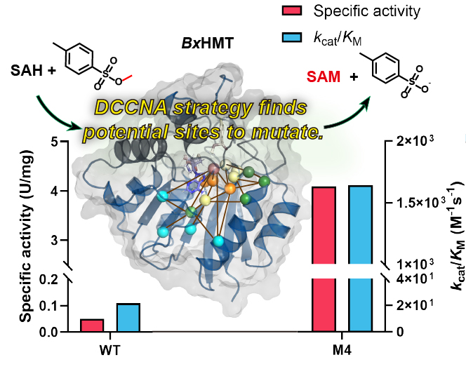研究团队提出的动态互相关网络分析分子改造策略,有效解决了过去长期存在的酶工程技术难以识别远端突变位点的问题,并可以大幅减轻筛选工作的负担。BxHMT-M4催化性能的显著增强也为非天然底物的有效利用带来了巨大希望。该突破为HMT与MT级联的甲基化反应的更广泛应用奠定了坚实的基础。