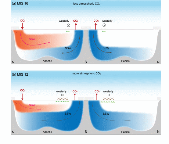 团队研究发现,虽然MIS 12和MIS 16表现出接近的大陆冰量,但MIS 16期北半球冰盖相对于MIS 12较大,而MIS 12南极冰盖相对于MIS 16较大,体现了两半球气候的不对称性。相对于MIS 16期,MIS 12期南半球西风减弱并向赤道移动,并伴随着南大洋深层水的扩张和全大洋深部水团趋于均一化。相对于MIS 16期,MIS 12更高的大气CO2可能与两半球大洋通风和深部水团重组有关。该研究揭示的MIS 12和MIS 16期这些海洋、气候特征的综合性差异,为轨道时间尺度上的碳循环和气候变化提供了新视角。