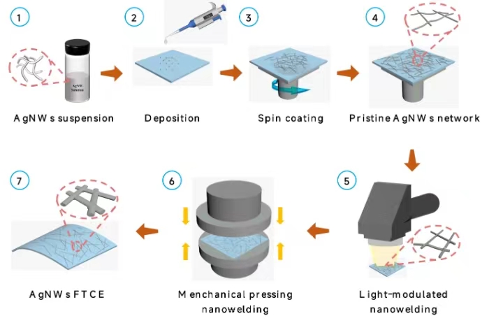 光/压调制焊接技术制备大面积AgNWs柔性透明导电电极工艺流程示意图。(课题组供图)