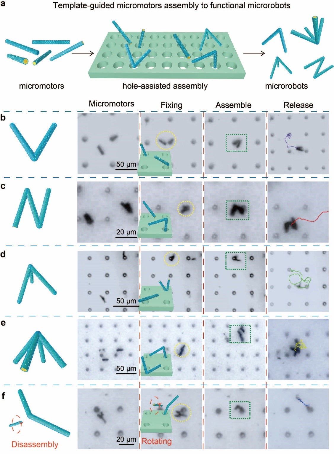 研究人员利用所开发的MIS结复合马达的磁性特征,创新性的提出了一种微洞阵列模板辅助组装的方法。他们首先将一个马达引导进入洞中固定,然后操控另一个马达与其组装,重复该过程即可实现不同结构微机器人的构建。除了组装,通过微洞还可实现解组装的操作。孔辅助组装为微纳机器人的构建提供了一种简单可行的策略。