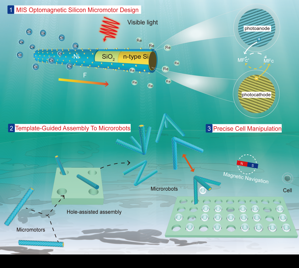 基于MIS结硅纳米线光磁复合马达的构建、模板辅助合理化组装微机器人及细胞操控示意图。研究团队供图