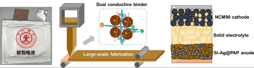 近日,西安交通大学金属材料强度国家重点实验室宋江选教授团队提出离子-电子混合导电粘合剂构建三维载流子快速传输新策略,解决了硫化物固态电池大规模制备和循环寿命难题,该研究成果发表于《先进材料》上。