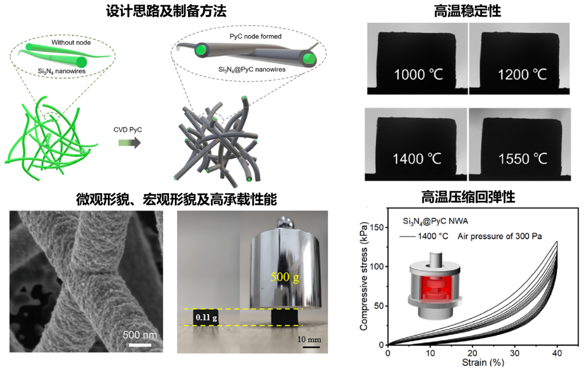 研究团队以氮化硅纳米线气凝胶为基体,采用化学气相沉积技术,在气凝胶中的纳米线表面引入热解碳(PyC)层,成功在纳米线间引入了大量的PyC结点,获得了一种Si3N4@PyC纳米线气凝胶,实现了陶瓷气凝胶强度和压缩回弹性的显著提升,突破了传统陶瓷气凝胶高强度和大回弹不能兼得的限制,为陶瓷气凝胶的强化和力学性能调控提供了新视角。此外,Si3N4@PyC NWA在高达1400℃的高温含氧条件下仍表现出优异的压缩回弹性能,展现了其在高温有氧环境的应用潜力。