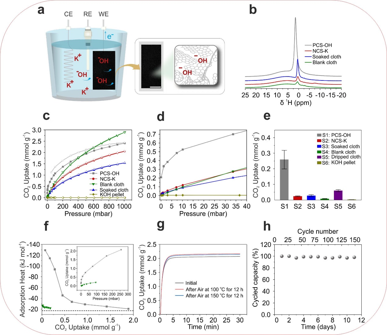 该研究提出了一种创新方法,通过电化学技术分离带电离子作为吸附位点,成功设计开发了一类新型吸附剂材料,并将其命名为“Charged sorbent(带电吸附剂)”。这种吸附材料利用类似电池的充电过程,在低成本活性碳的孔隙中,积聚大量活性氢氧根离子,并通过形成碳酸(氢)根的方式,迅速捕获空气中的二氧化碳。