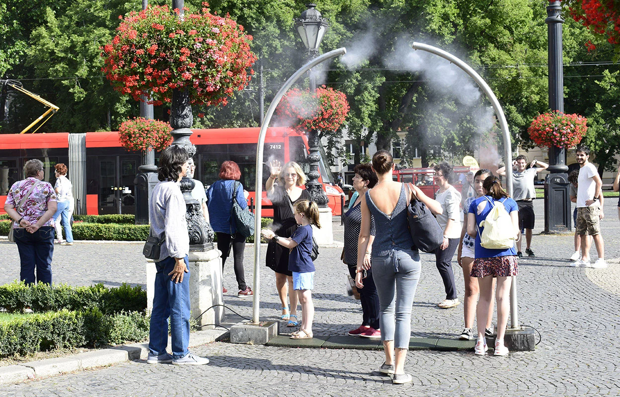 在捷克炎热的夏季里,一股水雾帮助人们降温。图片来源:Bilge Kagan Kaya/Alamy