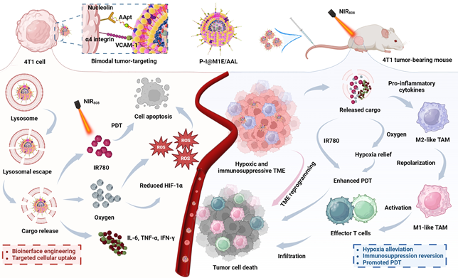 通过M1-Exo和AS1411适配体偶联脂质体(AApt-Lip)的共挤压制备了双靶向杂化M1-Exo囊泡(M1E/AAL),以装载IR780和PFTBA。P-I@M1E/AAL利用双靶向策略靶向肿瘤,结合M1-Exo介导的肿瘤归巢和适配体介导的受体-配体结合作用,实现对携氧剂和光敏剂的靶向递送。激光照射后,肿瘤部位活性氧和M1样TAM分布水平均升高,材料自身分泌细胞因子,这些作用共同介导了肿瘤细胞凋亡。P-I@M1E/AAL的治疗策略为重编程TME和增强光疗-免疫联合疗法提供了一种有前景的方法,为抗肿瘤治疗提供了一种潜在的治疗思路。