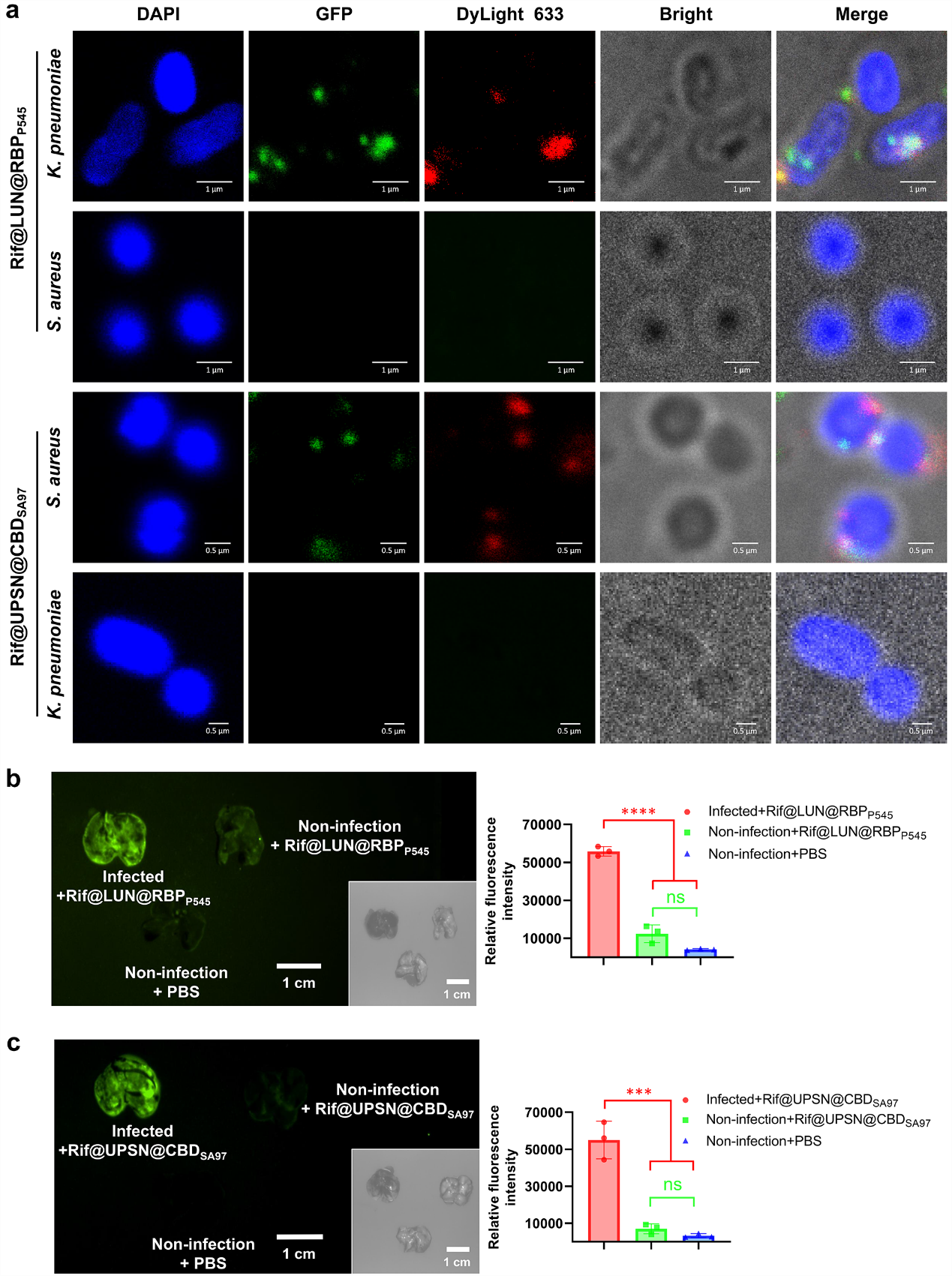 为有效应对耐药菌感染的问题,该研究首创了以病原菌特异性噬菌体受体结合蛋白(RBPs)和内溶素细胞壁结合域(CBDs)作为药物递送系统靶向模块实现抗生素体内精准高效递送的新策略。研究以基因工程手段获得的肺炎克雷伯菌噬菌体RBP和金黄色葡萄球菌噬菌体内溶素CBD作为纳米药物载体的靶向模块,分别将抗菌药物精准高效递送至了肺炎克雷伯菌和金黄色葡萄球菌感染的小鼠肺部,显著提高了抗生素的治疗效果。