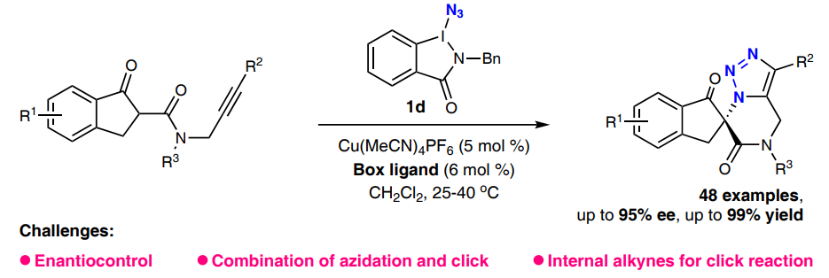 作为一种富有价值的骨架结构,1,2,3-三氮唑被广泛应用于药物发现、生物正交化学、合成化学和材料科学等领域。点击反应具有高效性和显著的生物相容性特点,已成为高效合成外消旋1,2,3-三氮唑的重要方法。受三氮唑骨架中没有sp3手性中心,以及叠氮化物和炔烃的线性几何结构等因素的影响,手性三氮唑的合成仍富有挑战性。