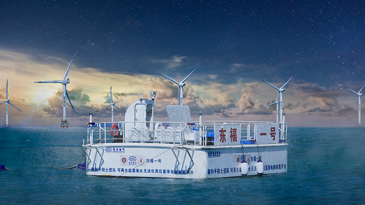 此前,谢和平团队在《自然》提出了海水原位直接电解制氢原理与技术,自主研制了每小时386 升氢气的原理样机,在海水中稳定制氢超3200小时,实现了把海水当纯水一样直接用于电解制氢。基于此,东方电气集团与谢和平团队研制了漂浮式海上制氢平台以及海上风电智慧稳定供电系统,实现了海上风电可再生能源和海水直接制氢的一体化技术。