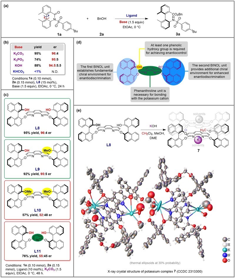 研究团队以不对称催化和手性分子的合成为主要研究方向,长期致力于新型手性催化剂的设计、发展和应用研究。为了发展非天然联芳基轴手性氨基酸不对称催化合成的新方法,研究团队设计合成了一种新型的轴手性菲罗啉钾络合物,并将该络合物作为催化剂,实现了联芳基内酰胺类化合物的醇解动态动力学拆分,高对映选择性地合成了一系列联芳基轴手性氨基酸衍生物。