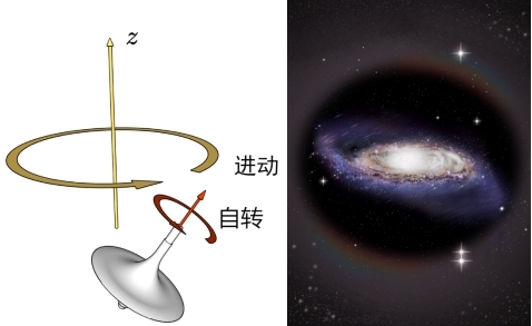 旋转的陀螺在重力力矩下产生进动及类比陀螺,银盘翘曲在暗物质晕的力矩下“翩翩起舞(进动)”。上海交通大学设计学院侯开元、董占勋制作的艺术想象图,科研团队供图