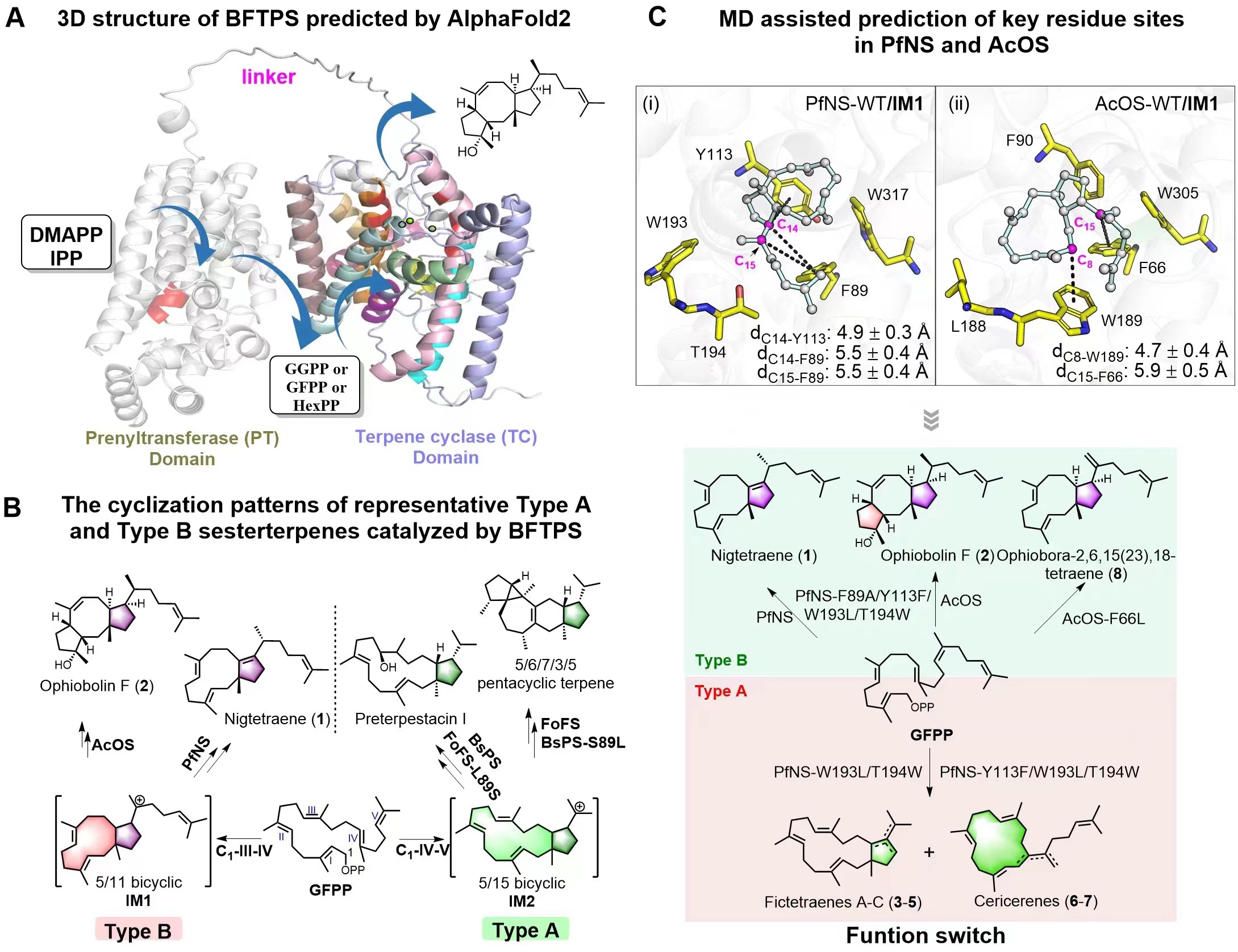 研究团队从自主构建的植物内生真菌酶库中选择了有改造潜力的萜合酶,结合分子动力学分析方法,比较TypeB型双功能二倍半萜合酶PfNS和AcOS的环化结构域,并推测双功能二倍半萜合酶的关键功能位点,对关键芳香族氨基酸簇和酶催化进行功能验证。在此基础上,研究团队实现了TypeB型二环和三环骨架的转换,为揭示萜类环系演化规律提供了重要的理论基础。此外,研究人员首次揭示了调控真菌双功能萜合酶催化TypeA和TypeB型二倍半萜功能转化的关键位点。