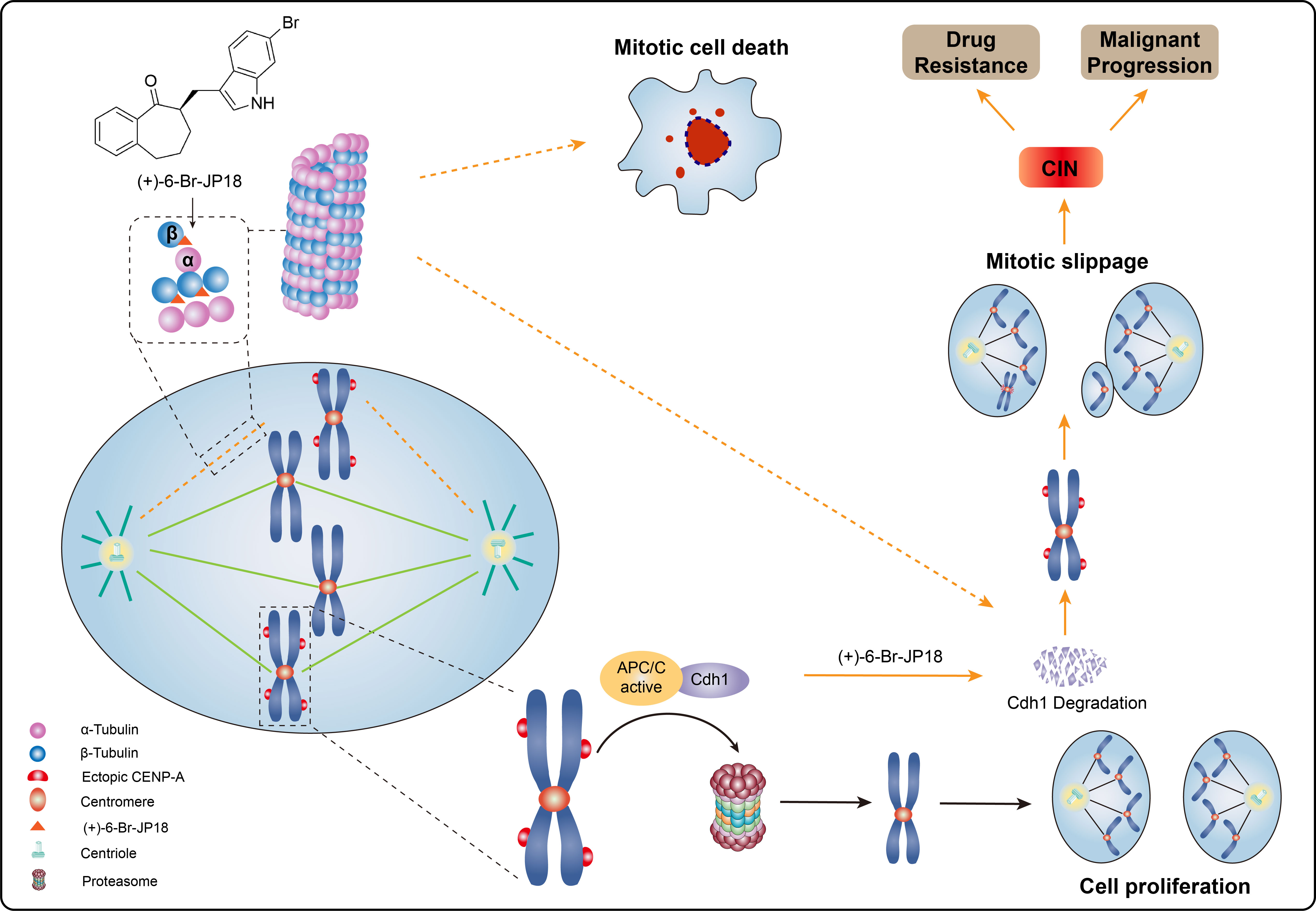 此次研究发现,JP18的两种吲哚6位卤代类似物具有更强的细胞周期阻滞活性,两个化合物都作用于β-微管蛋白的秋水仙碱结合位点。用包括这两个化合物在内的微管抑制剂处理人类细胞后发现,后期促进复合物/细胞周期体(APC/C)E3泛素连接酶共激活剂Cdh1水平下调,同时APC/C的底物CENP-A水平上调。研究团队分析指出,CENP-A的过度累积会影响有丝分裂过程中染色体的精确分离,并可能引起染色体不稳定性的出现。